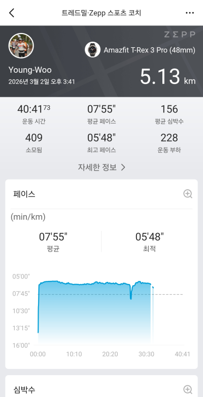 | 45 | 박정근 | 남 | 5Km | 00:42:29 | 아파트 헬스장 | ![]() |