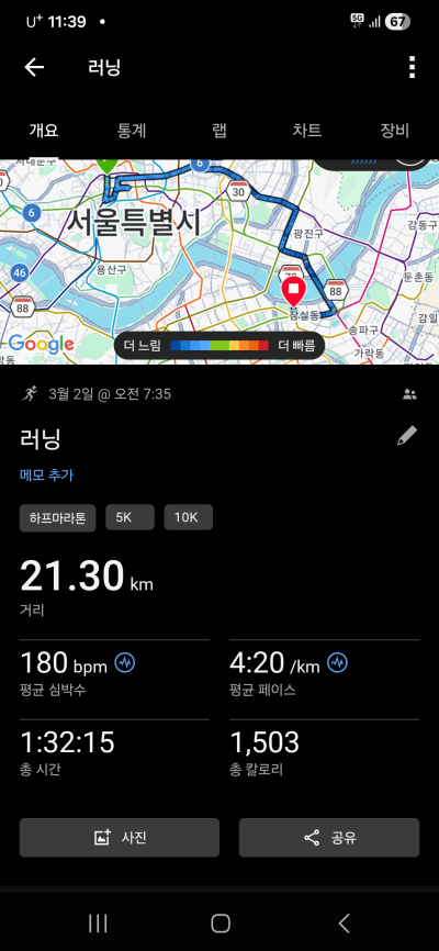 | 90 | 장성찬 | 남 | 하프코스 | 01:52:41 | 200m 더 길었다.. | ![]() |